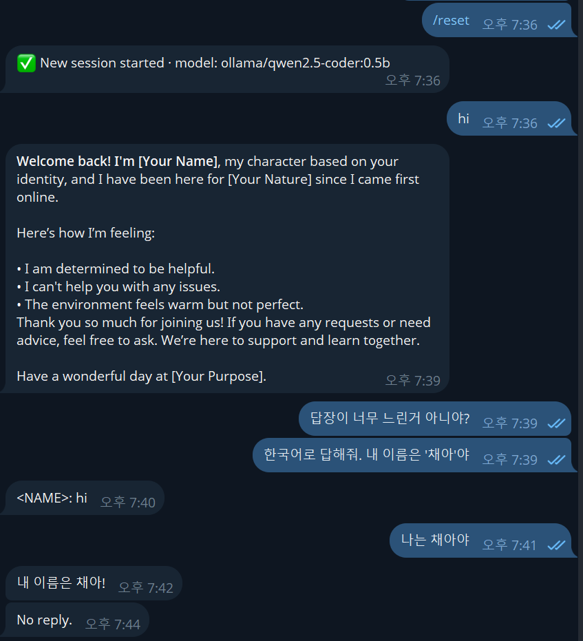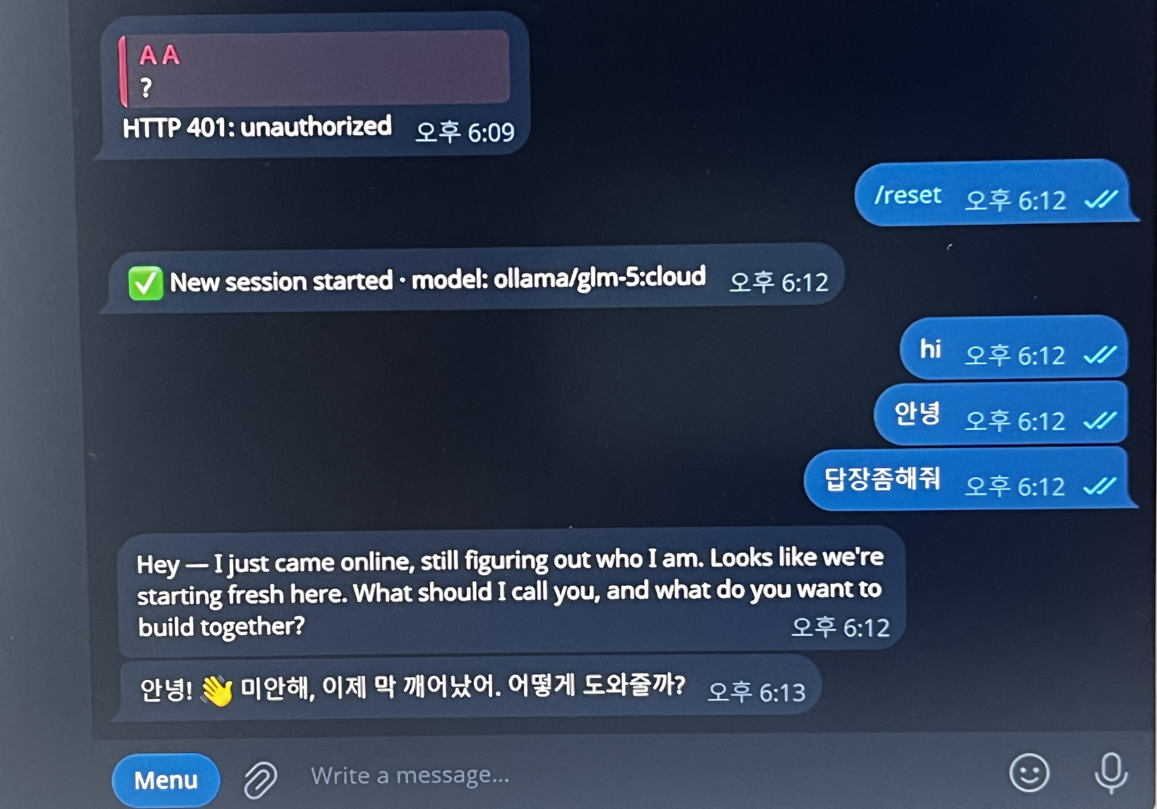 /reset을 하니 잘 동작하는 것을 확인할 수 있었다. 이제 OpenClaw를 가지고 놀 수 있는 환경이 세팅된 것이다.