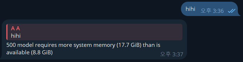 이전에 로컬 모델을 돌렸을 떄 응답이 안왔어서, 사양을 매우 내려 0.5B 모델을 돌여봤는데 응답이 느리게 오긴 했으나 대화가 전혀 안됐다.