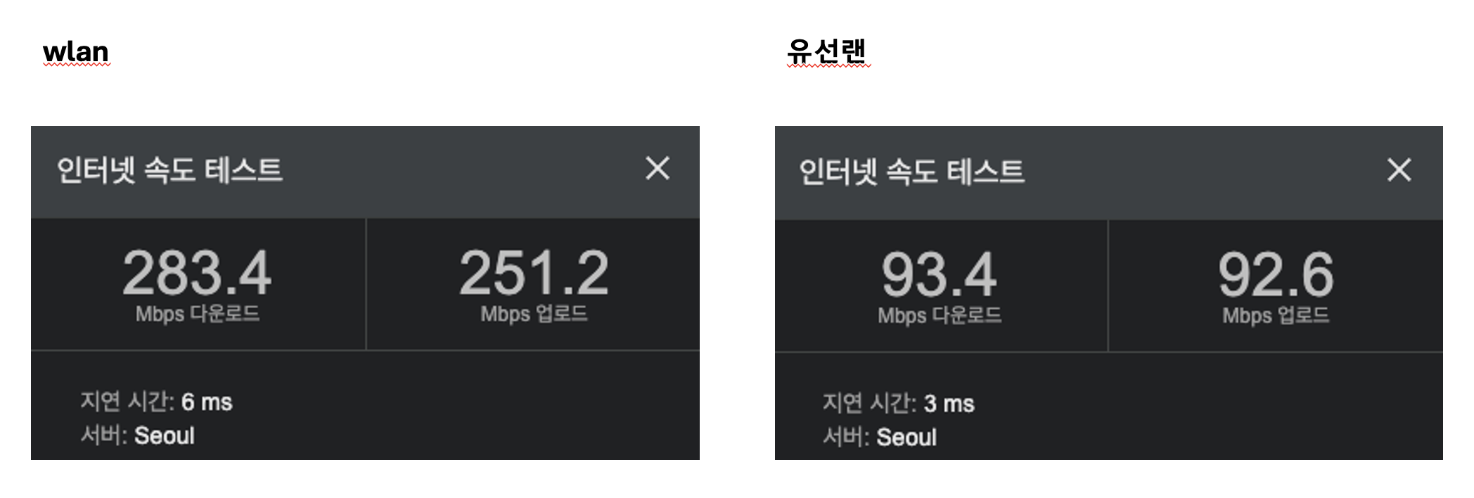 100Mbps면 무선보다 느리지 않을까해서 속도 비교를 해보았는데, 역시나 무선이 3배정도나 빨랐다.