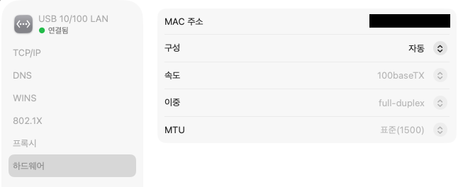 하드웨어 탭에서 '속도'를 보면 100baseTX라고 적혀있는데, 이 이름은 통신속도/채널종류/케이블종류를 의미한다. 100baseTX는 Category 5 UTP 케이블을 사용하며 최대 거리는 100미터, 전송 속도는 100Mbps짜리 케이블이다.